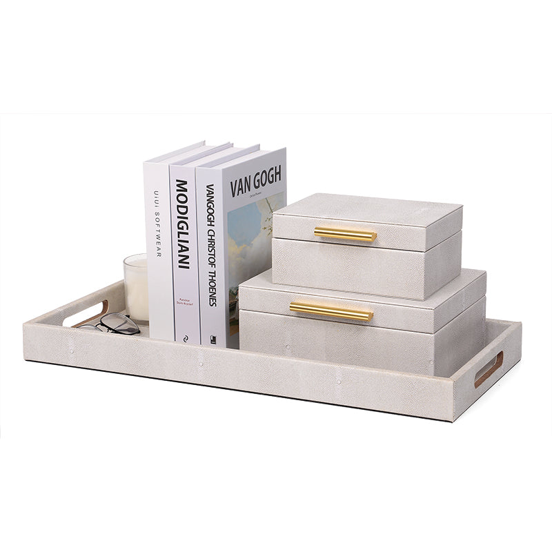 Refine your storage with the Story&Suns Decorative Storage Box Set of 2, elegantly wrapped in beige stingray-inspired vegan leather. Each box is designed with a durable hinged lid and accented by a sleek gold opening bar, adding a touch of modern luxury. Inside, the soft beige velvet lining protects your valuables, while the non-slip velvet base ensures stability and safeguards surfaces. Perfect as decorative storage boxes with lids for jewelry, keepsakes, or home essentials, this set blends timeless design with everyday functionality.