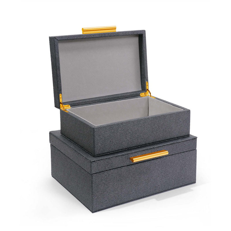 This Set of 2 Blue Vegan Shagreen Storage Boxes features a luxurious textured finish with brushed gold handles and clasps. Each box is velvet-lined inside and finished with a non-slip velvet base, combining elegance with everyday functionality.