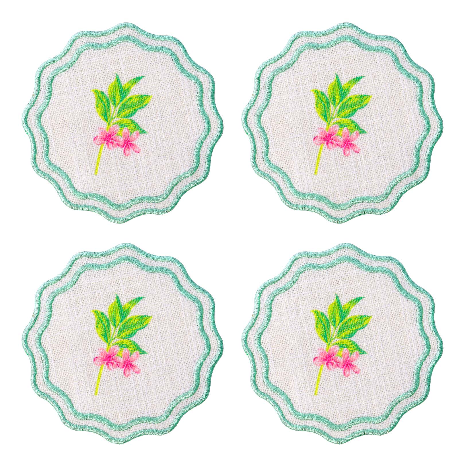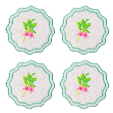 Tropical Floral Embroidered Linen Coasters with Scalloped Edge & TPU Non-Slip Backing, Wipe Clean, Set of 4