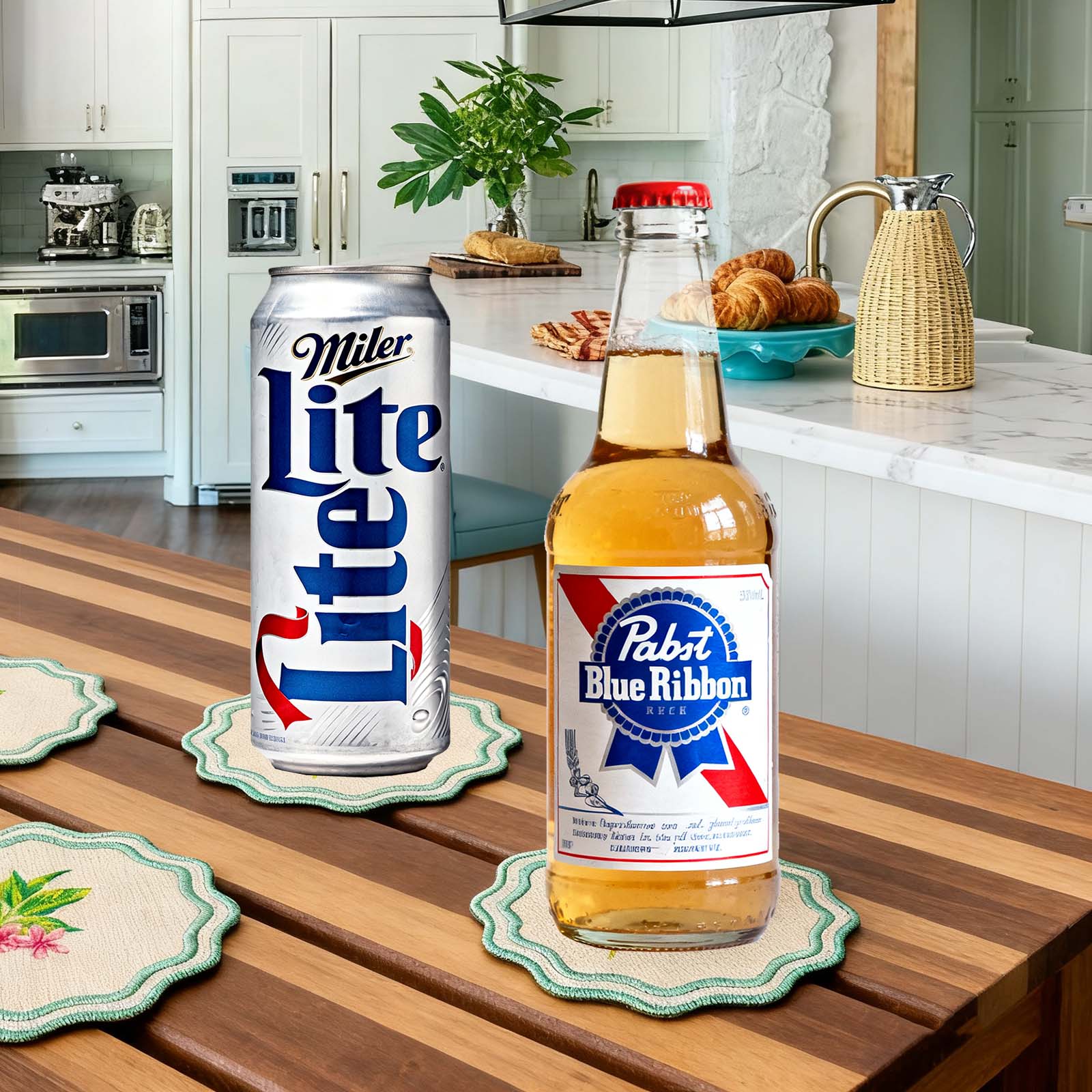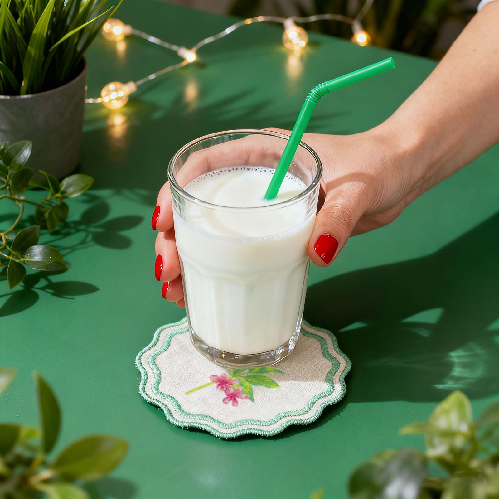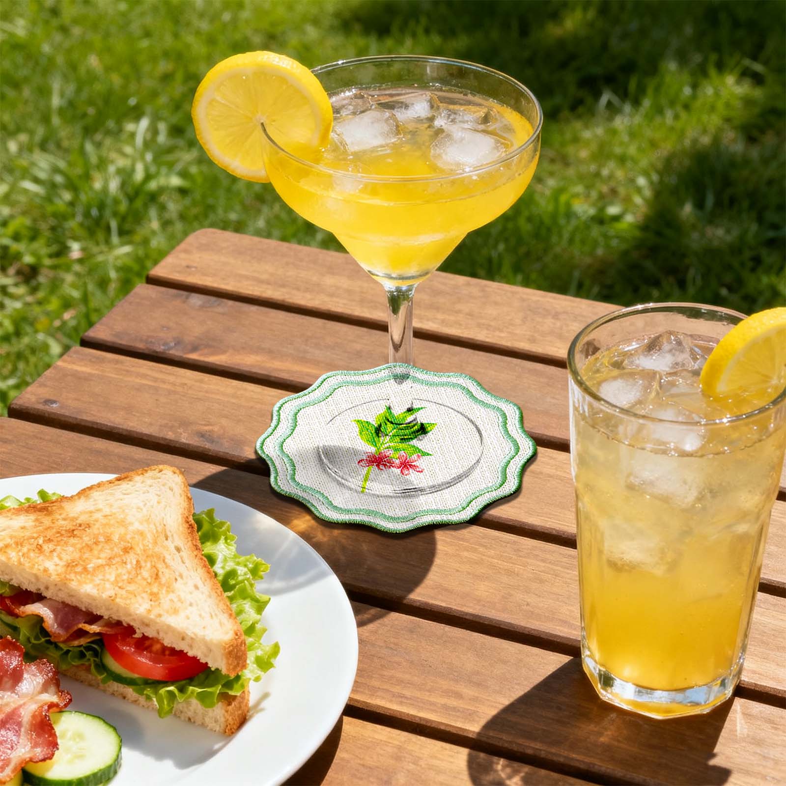 ring tropical elegance to your table with our Embroidered Linen Coasters, featuring a delicate scalloped edge and vibrant tropical flower print. Crafted from high-quality linen with refined embroidery, each coaster includes a TPU non-slip backing that protects surfaces and prevents sliding. Designed for everyday use, the wipe-clean surface ensures easy maintenance and long-lasting beauty. Perfect for coffee tables, dining settings, or as a stylish housewarming gift, this set of 4 combines function and artistry to elevate your home décor.